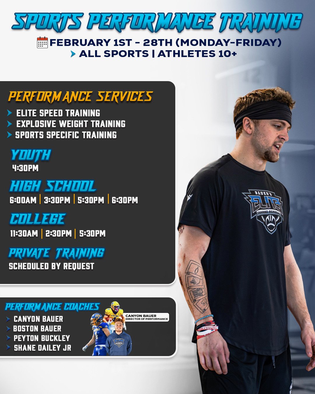 Coach Boston Bauer is the driving force behind Bauer’s Elite Training Academy, the #1 Football Academy in the Midwest—home to elite athlete development, Sharks 7v7, and Bauer’s Sports Rx: Sports Performance Training.